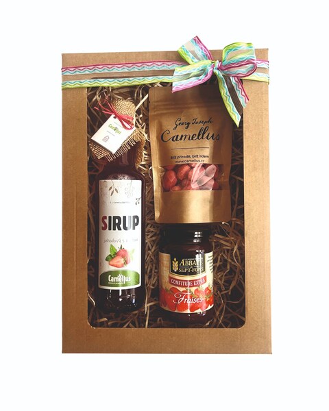Dárkový balíček Jahodová symfonie představuje harmonické spojení kvalitních ovocných produktů a jemné čokolády s mandlemi. Je koncipován jako vkusný a univerzální dárek, který potěší milovníky přírodních chutí i gurmány hledající vybranou delikatesu.