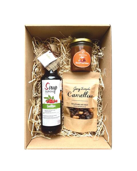 Tento kouzelný dárkový balíček je dokonalou kombinací chutí, které zahřejí nejen tělo, ale i duši. Šípkový sirup přináší lahodně sladkokyselé tóny plné vitamínů, ideální do horkých nápojů nebo jako přísada do dezertů. Vánoční čaj okouzlí svým aromatem voňavým kořením, které vytvoří tu pravou sváteční atmosféru. Oříšky v čokoládě pak přidávají dokonalou tečku – křupavé, jemně pražené oříšky obalené v sametově hladké čokoládě.