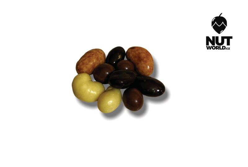 Složení: Mandle v hořké čokoládě 25%, kešu v bílé čokoládě25%, para v tiramisu 25% a lískové ořechy v mléčné čokoládě 25%.